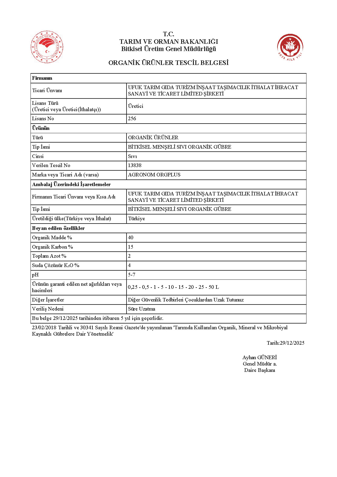 Yapraktan Genel Uygulama: 250-500 cc/50 Litre su ile dönüme uygulanır.