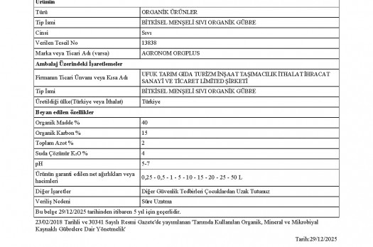 ETKİSİ: Agronom ORGPLUS; Yüksek oranda iyonik madde içeren bir organik sıvı gübredir. Bitkilerin organik madde ihtiyacını karşılayacak bir bitki besinidir. Her dönemde kullanılabilen bir organik gübredir.